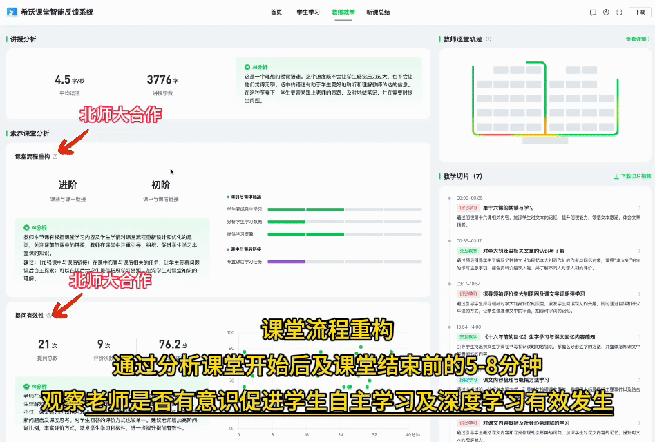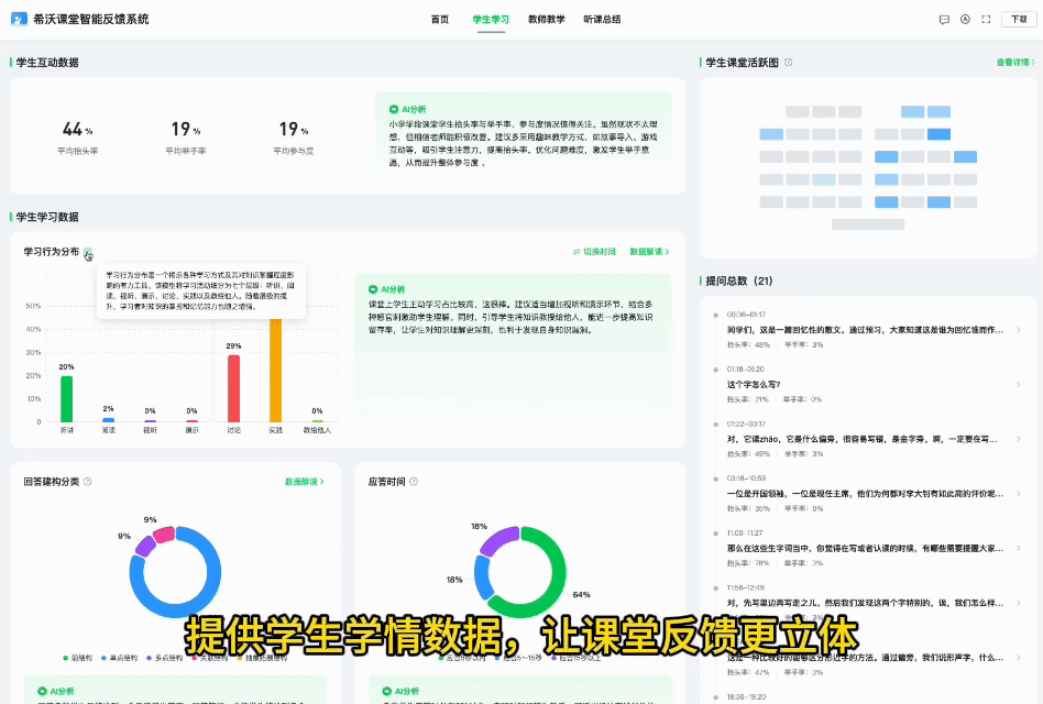 報告涵蓋豐富維度,在教師教學方面,對教師提問、啟發 、指導進行精準統計分析,讓教師清晰了解自己在課堂提問環節的引導策略成效;課后統計教師講授時長、語速等細節問題,助力教師合理把控課上教學節奏。