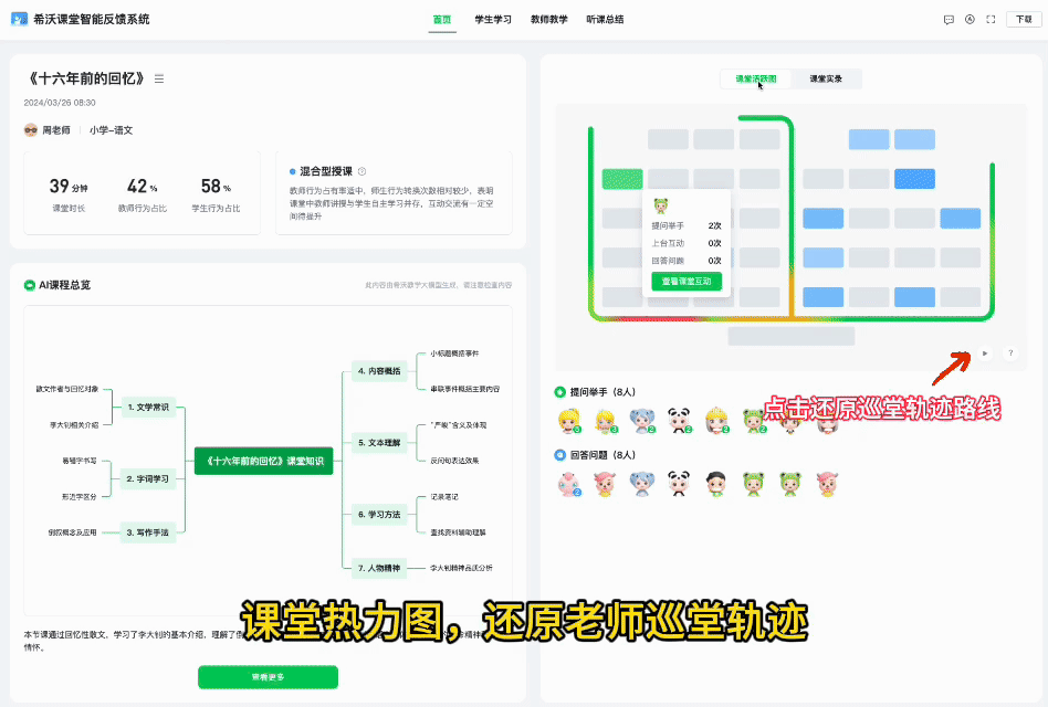 希沃AI課堂智能反饋系統還具備獨特的教室孿生建模與巡堂軌跡功能,以3D動態形式還原教師移動路徑和學生注意力熱區,直觀呈現課堂參與度的空間分布,為課堂管理提供科學理論依據。