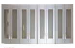全木結構:采用18mm厚三聚氰胺雙貼面板;柜門為木邊框鑲條紋磨砂玻璃/板式對開門。