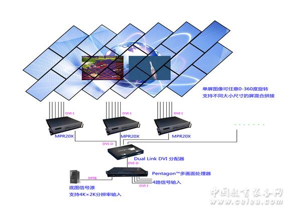 產品詳細介紹 MPR20X系列旋轉多屏拼接處理器是一臺純硬件無操作系統的高性能視頻圖像處理器,支持輸出屏幕畫面的任意旋轉功能,采用大視電子特有的異型拼接技術,所有的圖像旋轉和拼接都采用純硬件實現,具有極高的實時性和可靠性,且不需要對內容做任何的預處理,可以實現復雜和有創意的異型多屏拼接,從而實現無限拼接可能,多屏拼接不再是呆板的水平或垂直拼接,特別適用于創意展示,形象宣傳和數字標牌演示。 MPR20X系列旋轉多屏拼接處理器集高清視頻信號采集、實時高分辨率數字圖像處理、三維高階數字濾波等高端圖像處理功能于一身,具有強大的信號處理能力。本款產品采用純硬件FPGA架構,基于大視獨有的Flexview系列高性能視頻處理技術,從根本上保證對所有輸入信號源進行全實時處理和數據一致性,使得整體圖像高速同步,無刷新率和像素損失,獲得超高的顯示質量。 MPR20X系列旋轉多屏拼接處理器支持Displayport和Duallink DVI等超高分信號的輸入。對計算機視頻信號,能兼容支持各種常見分辨率,并可靈活的實現非常規分辨率自定義。PixTornado龍卷風系列多屏拼接處理器可輸出DVI-I信號,支持VGA(模擬)/DVI(數字)同時輸出,這意味著可以在大屏幕正常顯示的同時,將信號備份輸出至另一組大屏幕,還支持雙DVI-I通道備份。單個輸出通道最高支持分辨率1920×1200@60Hz,且所有輸出分辨率可自定義,具有極大的靈活度;同時支持不同尺寸的顯示單元和不同分辨率的顯示單元混用。 通過多臺MPR20X可以實現多臺顯示單元的異形拼接功能. http://www.mviewtech.com/list.asp?ProdId=120827130334 多臺MPR20X支持超大旋轉拼接處理