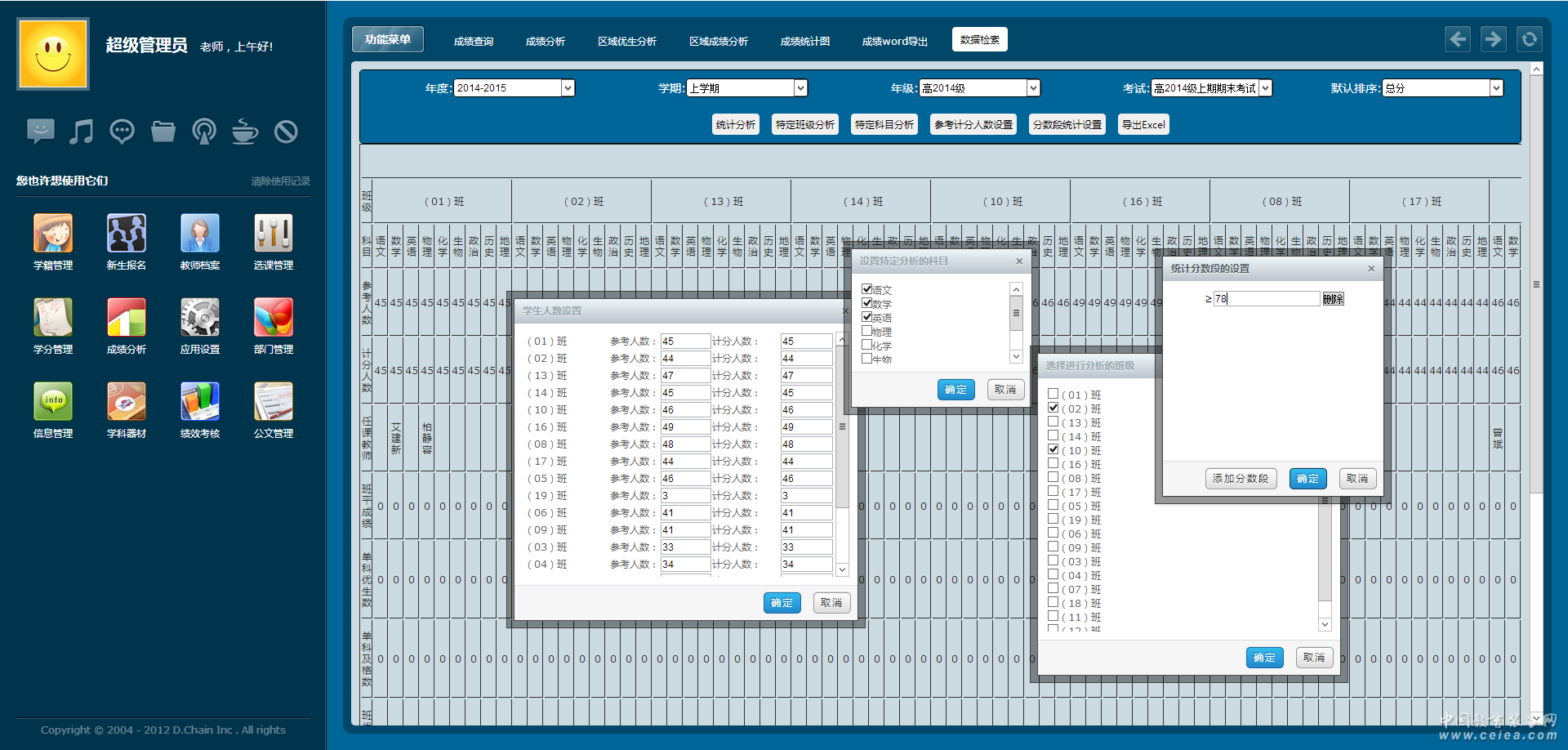 成績查詢 包含單次或者多次學生成績綜合查詢。 自定義分析模板 根據學校成績分析的實際要求配置分析報表,如配置計分人數、參考人數、班平均成、單科優生數、單科及格數、班優生均分、年級優生均分、優生差距、各科總分等自定義設置。 成績分析 包含成績整體分析、特定班級成績分析、分數段分析、計分及參考人數靈活設置,分析報表由Excel生成。 成績統計 班級報表根據總分、計算公式、單科名次排序、、班級前幾名、年級前幾名、年級及班級分數段來查詢及生成統計報表。 成績報表 采用柱形、線型、餅形對成績進行分析,包含(年級、班級、學生)三種形式,分析內容包含了班平均分、年級均分、分數段、優生均分、及格分、優生差距、總分、單科及總成績名次等,生成圖表。 成績Word裝檔 采用將學生在校的所有考試成績生成word二維表的形式(每個學生自動一頁),可在線打印或班級學生匯總成績Word生成下載。 |