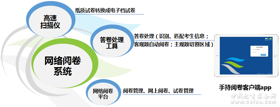 1)答卷處理:考號識別、客觀題自動閱卷,主觀題圖片切割后網(wǎng)閱; 2)閱卷管理:角色定義、閱卷任務(wù)分配;閱卷進(jìn)度管理; 3)試卷管理:試卷調(diào)取、批閱留痕、試卷電子存檔。