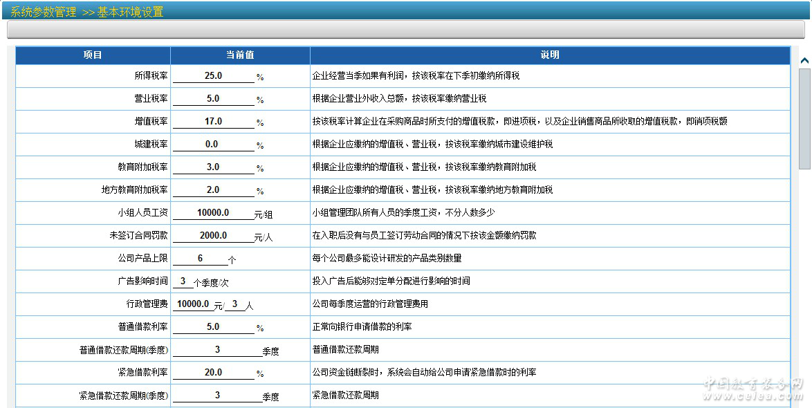 以下對各參數(shù)含義及內(nèi)容進行簡要說明: 所得稅率:每個季度運營如果有利潤,需按此比例繳納所得稅; 營業(yè)稅率:企業(yè)的營業(yè)外收入,需按此比例繳納營業(yè)稅; 增值稅率:在原料買賣和產(chǎn)品專賣時,需要按此稅率繳納增值稅; 城建稅率:根據(jù)企業(yè)應納稅額,按此稅率繳納城市建設維護稅; 教育附加稅率:根據(jù)企業(yè)應納稅額,按此稅率繳納教育附加稅; 地方教育附加稅率:根據(jù)企業(yè)應納稅額,按此稅率繳納地方教育附加稅; 小組人員工資:參加訓練的小組學生作為企業(yè)的管理團隊,不計人數(shù)多少,統(tǒng)一按這個金額支付管理人員的工資; 未簽訂合同罰款:在入職后沒有與員工簽訂勞動合同的情況下按該金額繳納罰款 公司產(chǎn)品上限:每個公司可以針對消費者設計多個產(chǎn)品品牌,這是品牌的上限數(shù); 廣告影響時間:每季投入的廣告在未來若干個季度仍會有一定影響,這是影 響的最大周期數(shù); 行政管理費:每季需要開支的行政管理費用,與公司人數(shù)規(guī)模有關; 普通貸款利率:正常向銀行申請貸款的總利率; 普通貸款還款周期:銀行正常貸款的歸還時間; 緊急貸款利率:在企業(yè)資金鏈斷裂時,銀行會自動向企業(yè)發(fā)放緊急貸款,利率要遠高于正常申請的貸款;企業(yè)不能主動申請緊急貸款; 緊急貸款還款周期:銀行緊急貸款的歸還時間; 同期最大貸款授信額度:在一個季度內(nèi),正常向銀行申請的最大貸款總金額; 一賬期應收賬款貼現(xiàn)率:在一個季度后到期的應收賬款,可以提前申請貼現(xiàn),按此利率支付貼現(xiàn)利息; 二賬期應收賬款貼現(xiàn)率:在二個季度后到期的應收賬款,可以提前申請貼現(xiàn),按此利率支付貼現(xiàn)利息; 三賬期應收賬款貼現(xiàn)率:在三個季度后到期的應收賬款,可以提前申請貼現(xiàn),按此利率支付貼現(xiàn)利息; 四賬期應收賬款貼現(xiàn)率:在四個季度后到期的應收賬款,可以提前申請貼現(xiàn),按此利率支付貼現(xiàn)利息; 市場訂單未完成部分罰金率:所有訂單要求當季度交貨,如未能及時交貨,將根據(jù)未交貨產(chǎn)品的合同總額按此比例予以處罰; 市場需求預測提前期:公司在市場分析報告中可以查看到的未來多少季度的需求; 辦公場地所需費用:公司租賃辦公場所,每季度需要支付的房屋租金; 公司注冊費用:公司在設立過程中所需支付的所有費用; 養(yǎng)老保險比率:根據(jù)工資總額按此比率繳納養(yǎng)老保險費用; 失業(yè)保險比率:根據(jù)工資總額按此比率繳納失業(yè)保險費用; 工傷保險比率:根據(jù)工資總額按此比率繳納工傷保險費用; 生育保險比率:根據(jù)工資總額按此比率繳納生育保險費用; 醫(yī)療保險比率:根據(jù)工資總額按此比率繳納醫(yī)療保險費用; 盈利表現(xiàn):最終評價公司績效的綜合評價分數(shù)的其中一項,所占的權(quán)重大小; 財務表現(xiàn):最終評價公司績效的綜合評價分數(shù)的其中一項,所占的權(quán)重大小; 市場表現(xiàn):最終評價公司績效的綜合評價分數(shù)的其中一項,所占的權(quán)重大小; 投資表現(xiàn):最終評價公司績效的綜合評價分數(shù)的其中一項,所占的權(quán)重大小; 成長表現(xiàn):最終評價公司績效的綜合評價分數(shù)的其中一項,所占的權(quán)重大小; 綜合評價下限:綜合評價中的五個項目,每個項目最低得分是權(quán)重分乘以此系數(shù); 綜合評價上限:綜合評價中的五個項目,每個項目最高得分是權(quán)重分乘以此系數(shù); 產(chǎn)品研發(fā)每期投入:每個季度在需要進行研發(fā)的產(chǎn)品上投入的研發(fā)金額; 產(chǎn)品設計費用:每設計或修改一個品牌所需花費的金額; 廠房折舊率:購買的廠房,每個季度按此折舊率計提折舊; 設備折舊率:購買的設備,每個季度按此折舊率計提折舊; 緊急借款扣除分數(shù):每出現(xiàn)一次緊急借款,綜合表現(xiàn)所扣除的分數(shù) 每季廣告最低投入:每季度最低廣告投入金額 經(jīng)營范圍:工商注冊時需要的企業(yè)經(jīng)營范圍的描述內(nèi)容;