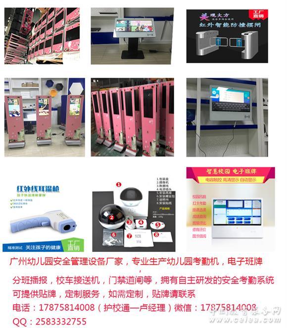 產品詳細介紹廣州護校通專業校園安防廠家,主要為各大營銷公司和校園,提供校園安防設備和定制生產業務。主營產品有幼兒園打卡機,電子班牌,道閘,校車刷卡機,分班播報等。 護校通經營校園安防設備多年,經驗豐富,能及時處理產品問題。擁有4000方生產廠房,分為生產車間和組裝車間,配備大型生產設備,廠房有著專業的生產團隊和組裝團隊,員工達100多人。護校通有著一套完善的生產管理體系,生產效率高,產品質量一流。護校通還有300方獨立營銷中心,有著專業軟件技術人員,銷售,售后團隊能為客戶提供全方位的服務。 護校通產品系列豐富,幼兒園打卡機有三大安裝方式(壁掛式,立式弧度,立式)四大尺寸(10.1寸15.6寸21.5寸32寸) 幼兒園打卡機功能詳情: 1、刷卡接送:采用先進的非接觸式 IC智能卡技術,作為接送人員標識,刷卡提高了接送幼兒的安全性,持無效卡接送系統將出現報警。 2、顯示接送人照片:幼兒離園時由接送人在刷卡設備上進行刷卡,系統將顯示兒童和接送的信息與照片,幫助門衛分辨接送人是否為幼兒家屬。 3、拍照記錄:護校通刷卡機裝配有高清攝像頭,接送人在刷卡設備上進行刷卡時,系統會自動拍照存儲,持無效卡刷卡,無任何反應。 4、幼兒信息管理:系統可管理幼兒生源、班級、升級、插班、退學等信息,可記錄家長電話、接送人照片,使您輕松全面的管理幼兒信息 5、出勤報表匯總:系統可進行缺勤管理(缺勤的時間、事由),并能查看各班每日、每周、每月的出勤匯總報表,便于老師查看匯總信息。 6、微信端提醒:家長通過關注護校通公眾號,當接送人刷卡時,系統會自動發送接送信息給指定手機。 幼兒園打卡機參數: 系統版本:Android 4.4及以上。 2.攝像頭功能和智能刷卡功能; 3.內置高品質音箱喇叭,音色完美; 4.金屬質感,新款高檔模具! 5.鏡面鋼化玻璃面板,高端大氣,有效保護液晶屏幕; 6.工業級散熱標準,延長機器使用壽命; 7.操作簡單,系統穩定; 8.CPU:全志A20雙核處理器/A31四核處理器/A83八核處理器 9.運行內存:1G/2G 10.機身內存:4G/8G 11.顯示:原裝顯示屏、高清分辨率 11.有線網絡:RJ45 12.無線網絡:支持WIFI 13.數據傳輸協議:TCP/IP通訊協議 14.電源:AC 220V 15.使用環境溫度:(-10℃) -70℃ 濕度10%-90% 16.視頻攝像:200萬像素,廣視角達130度,高清彩色攝像頭 17.USB接口:USB2.0高速接口 護校通生產幼兒園打卡機多年,產品銷售遍布全國,多年來,客戶在使用期間,產品未出現過質量問題,退換貨也極少發生,得到了各大學校和營銷公司的一致好評。護校通一直以優質的產品,實惠的價格與向各大公司供貨,只需五十臺便可以定制生產,定制你想要的尺寸,logo。給你一個最實惠的價格,降低你的運營成本,提升你的利潤空間。 護校通承諾凡是購買本司的幼兒園刷卡機,都可以享受到兩年保修,半年內包來回運費。 如需購買,批發,定制幼兒園打 |