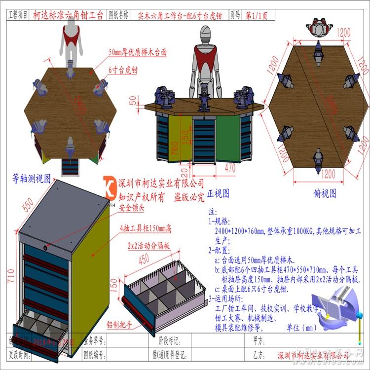 與普通的六角工作臺相比,柯達六角工作臺具有六邊多工位、組裝式結構、帶工具柜臺虎鉗等特點。臺面中間設置有電源氣源接口臺,配備單相220V,三相380V電源插座和氣源接口(各六個)。臺面中間配小臺面每邊邊長550mm;用于連接各類電氣、氣源接頭、開關等電器群。 六角鉗工臺突破傳統鉗工桌不同,它配備有臺虎鉗、銼刀、鉆 鉸刀、磨床等鉗工工具,滿足加工零件、模具裝配、設備維修等各種鉗工作業(yè)需要,極大的方便了鉗工的作業(yè)和生產.