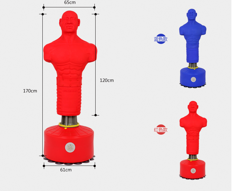 宣泄人底座采用聚乙烯丙塑料材質,強度高韌性強。注水固定,注水后達80公斤,直徑為65CM,高度為45CM。顏色:紅色、藍色