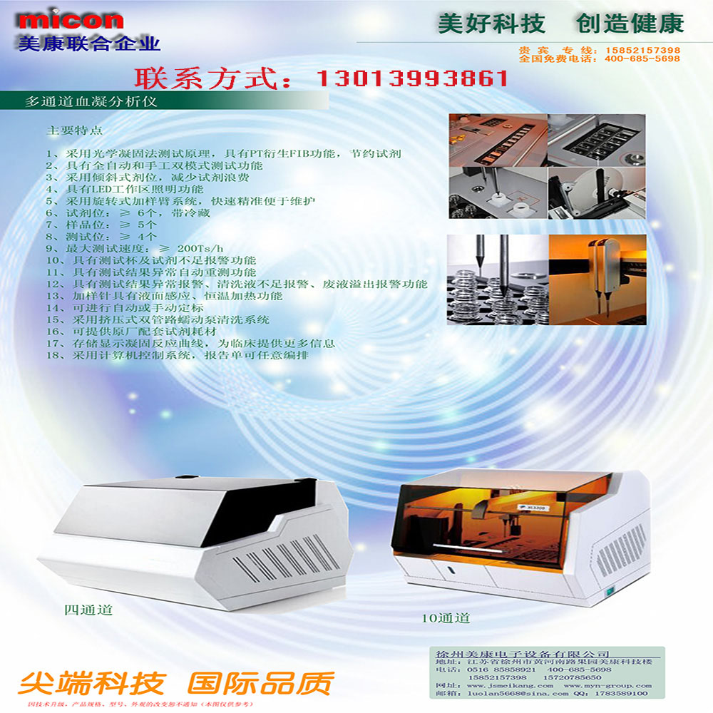 產品詳細介紹多通道血凝分析儀 主要特點 1.采用光學凝固法測試原理,具有PT衍生FIB功能,節約試劑 2.具有全自動和手工雙模式測試功能 3.具有傾斜式劑位,減少試劑浪費 4.具有LED工作區照明功能 5.采用旋轉式加樣臂系統,快速精準便于維護 6.試劑位:≥6個,帶冷藏 7.樣品位:≥5個 8.測試位:≥4個 9.最大測試速度:≥200Ts/h 10.具有測試杯及試劑不足報警功能 11.具有測試結果異常自動重測功能 12.具有測試結果異常報警、清洗液不足報警、廢液溢出報警功能 13.加樣針具有液而感應、恒溫加熱功能 14.可進行自動或手動定標 15.采用擠壓式雙管路蠕動泵清洗系統 16.可提供原廠配套試劑耗材 17.存儲顯示凝固反應曲線,為臨床提供更多信息 18.采用計算機控制系統,報告單可任意編排 |