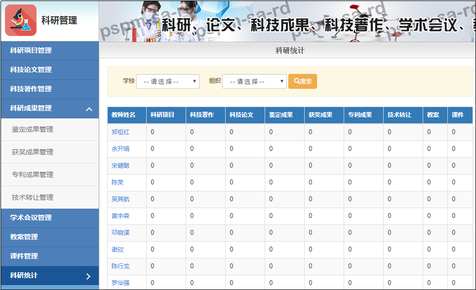 科研管理系統(tǒng)用于管理學(xué)校科學(xué)研究工作各項(xiàng)資料,確保學(xué)校的“科研項(xiàng)目管理,科技著作管理,科技論文管理,學(xué)術(shù)會(huì)議管理,鑒定成果管理,專(zhuān)利成果管理,技術(shù)轉(zhuǎn)讓管理,獲獎(jiǎng)成果管理,教案管理,課件管理”等科研信息得到統(tǒng)一登記和管理。