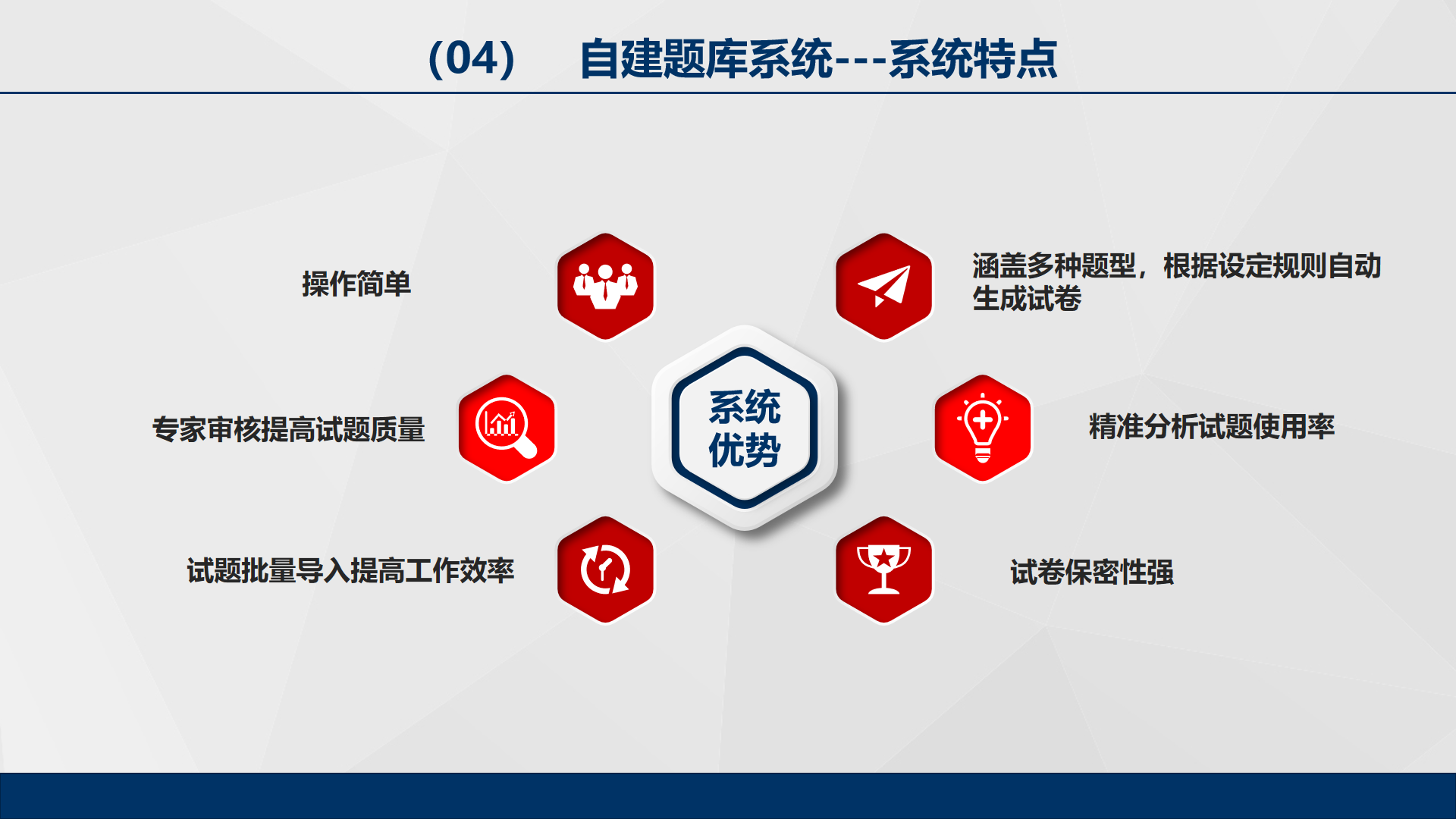 產(chǎn)品詳細介紹自建題庫管理系統(tǒng),系統(tǒng)實現(xiàn)了教考分離,操作簡單、涵蓋多種題型,根據(jù)設(shè)定規(guī)則自動生成試卷、專家審核提高試題質(zhì)量、精準(zhǔn)分析試題使用率、試題批量導(dǎo)入提高工作效率、試卷保密性強。