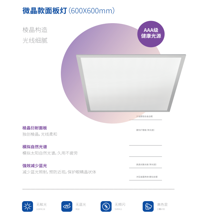 光電 參數 1 總光通量 >3000Lm 2 燈具額定壽命 ≥50000h 3 藍光危害 RG0 4 平均維持照度lux 照度≥500lux 5 照度均勻度 均勻度≥0.8 6 防眩指數 UGR<16 7 顯色指數 Ra>95,R9>95 8 波動深度 1.0%