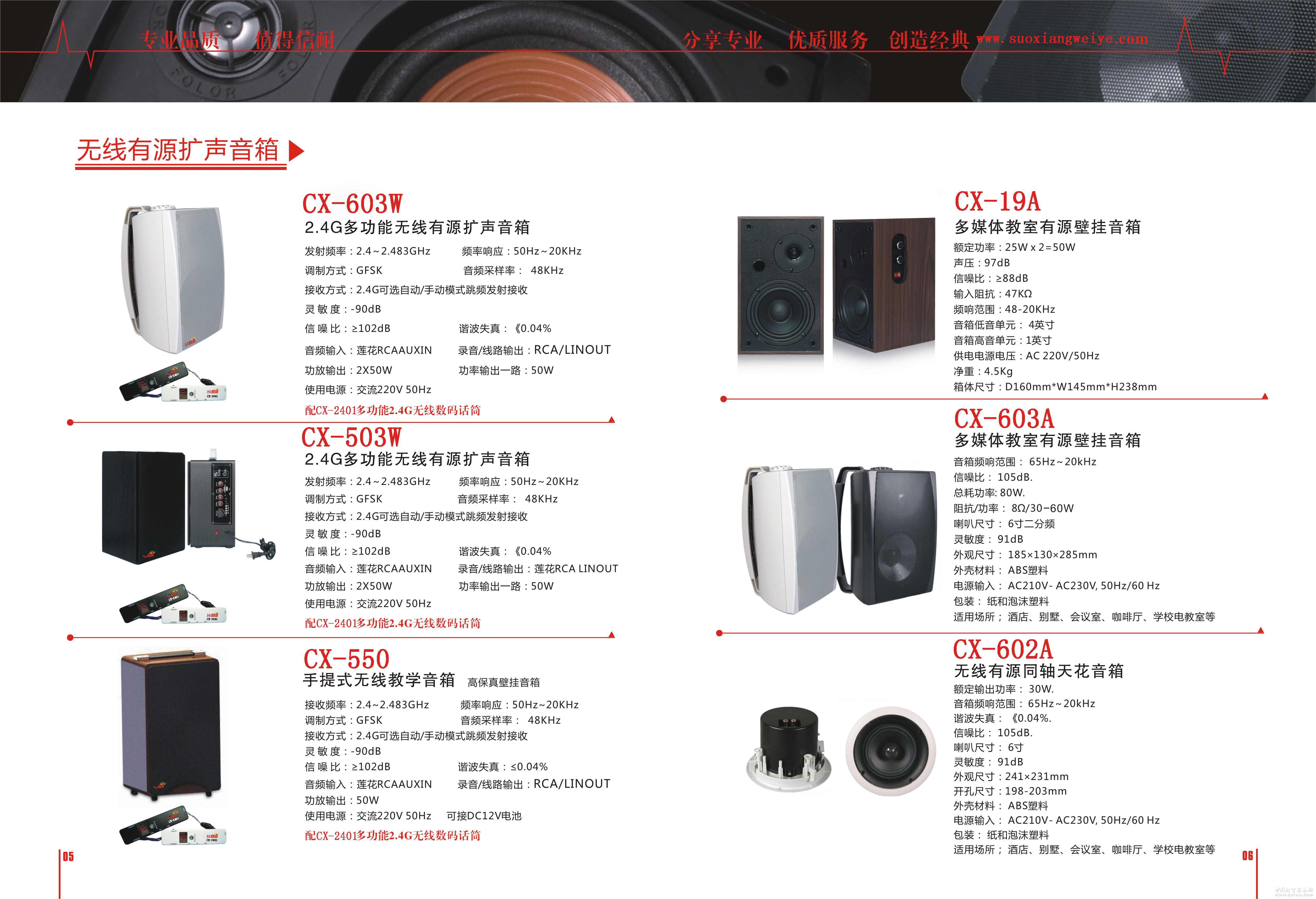 有源壁掛音箱:又名主動式壁掛音響,因其安裝方式為掛在墻壁上而得名,所以也稱之為:有源掛壁音箱或主動式掛壁音響;有源壁掛音箱是公共廣播系統、會議系統中重要的一員,常用于多媒體會議室、多媒體電教室、學校走廊、過道、超市、商場、工廠車間、寫字樓、辦公室等;作為公共廣播或會議系統音頻信號的放大還原設備。 有源壁掛音箱按輸入信號的方式不同,可分為:定阻型有源壁掛音箱、定壓型有源壁掛音箱和有源型有源壁掛音箱。