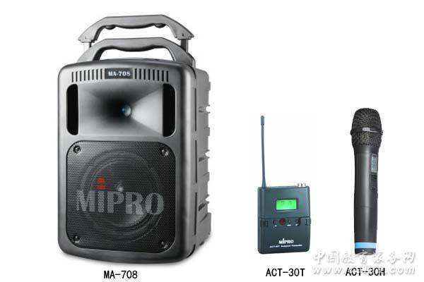 產品詳細介紹臺灣MIPAO咪寶MA-708專業無線擴音機 主要特點 1、專利的高音號角式一體成型的雙音路喇叭箱,內建高效率的號角式高音及8吋中低音喇叭、190W的D類超高效率放大器驅動、播出清晰強勁的音量,具有自動限制失真之功能,避免大音量時產生失真。 2、首創主音量采用數字式控制。 3、專利的獨特工藝造型,擴充配件模塊化,可快速拆裝更換。 4、貼心設計,首創一體成型的伸縮拖拉把柄及滑輪設計,可以拉著它走到哪里使用到哪里! 5、具有腳架底座可以固定裝置在三腳架上使用,隱藏式麥克風收納盒,便于麥克風的收納。 6、可同時使用有線、無線麥克風、CD或USB等混合擴音,具有VOP廣播優先切換的功能,當音樂播放中使用麥克風擴音時,音樂會自動靜音。具有切換ECHO回音功能。 7、可裝配高達四頻道最先進的ACT自動選訊接收模塊,同時使用四支發射器擴音,使用距離遠,接收穩定、抗干擾特性強。 8、機箱內建AC交換式電源供應器,可插接世界各種電壓不必切換,可同時提供擴音機的電源及電池的快速充電,可一邊充電一邊使用,停電照常全功能動作。 9、具有4段電池容量顯示燈,可以明確指示電池剩余電量及充電狀況。 10、可加裝無線中繼發射器MTM-90,擴充傳輸范圍,適合大空間播音多元化機動性的應用。