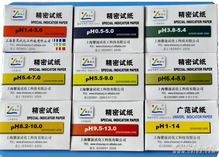 1,pH0.5-5.0:精度為顯色反應間隔0.5,分變色域pH:0.5、1.0、1.5、2.0、2.5、3.0、3.5、4.0、4.5、5.0,共10檔。 2,pH1.4-3.0:精度為顯色反應間隔0.2~0.5,分變色域pH:1.4、1.7、1.9、2.1、2.5、3.0,共6檔。 3,pH3.8-5.4:精度為顯色反應間隔0.2~0.3,分變色域pH:3.8、4.1、4.4、4.6、4.8、5.1、5.4、5.4以上,共8檔。 4,pH5.4-7.0:精度為顯色反應間隔0.2~0.4,分變色域pH:5.4以下、5.4、5.8、6.2、6.4、6.7、7.0、7.0以上,共8檔。 5,pH5.5-9.0:精度為顯色反應間隔0.5,分變色域pH:5.5、6.0、6.5、7.0、7.5、8.0、8.5、9.0,共8檔。 6,pH6.4-8.0:精度為顯色反應間隔0.2~0.3,分變色域pH:6.4、6.7、7.0、7.2、7.5、7.7、8.0、8.0以上,共8檔。 7,pH8.2-10:精度為顯色反應間隔0.2~0.4,分變色域pH:8.2、8.5、8.8、9.0、9.3、9.7、10.0、10.0以上,共8檔。 8,pH9.5-13:精度為顯色反應間隔0.5,分變色域pH:9.5、10.0、10.5、11.0、11.5、12.0、12.5、13.0,共8檔。
