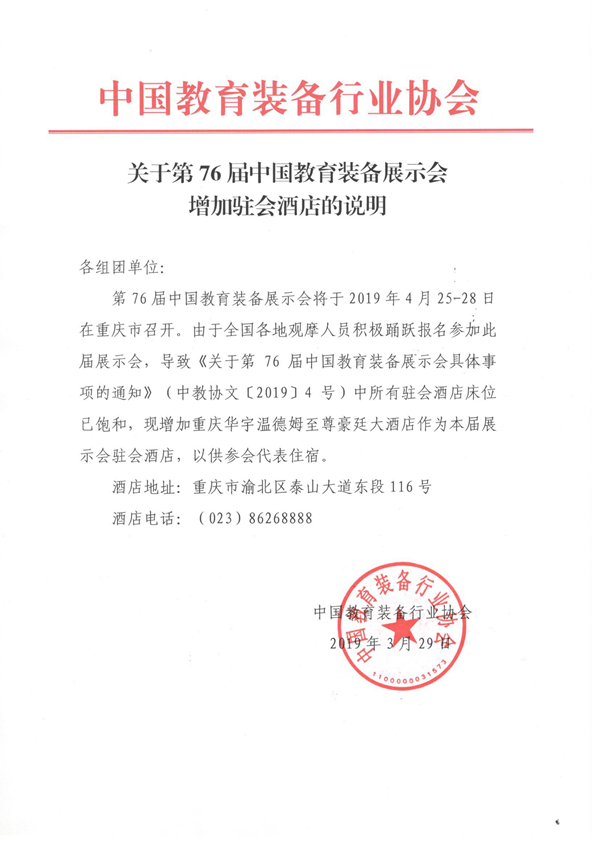 第76屆中國教育裝備展示會將于2019年4月25-28日在重慶市召開。由于全國各地觀摩人員積極踴躍報名參加此屆展示會,導致《關于第76屆中國教育裝備展示會具體事項的通知》(中教協文〔2019〕4 號)中所有駐會酒店床位已飽和,現增加重慶華宇溫德姆至尊豪廷大酒店作為本屆展示會駐會酒店,以供參會代表住宿。